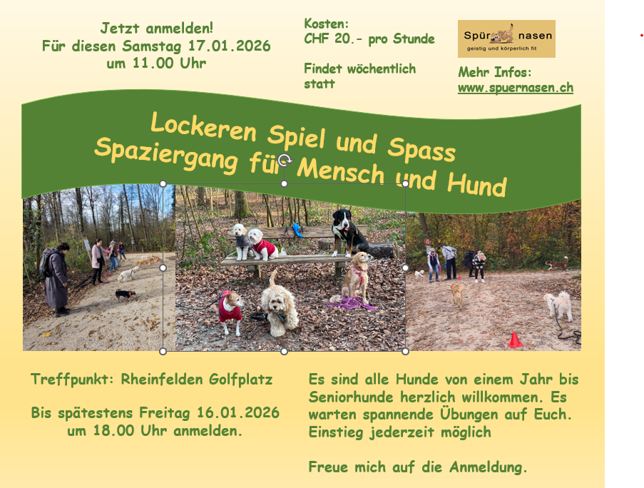 weitere Infos und Anmeldung unter: Sapziergänge mit Spiel und Spass für Mensch und Hund – Spürnasen (spuernasen.ch)